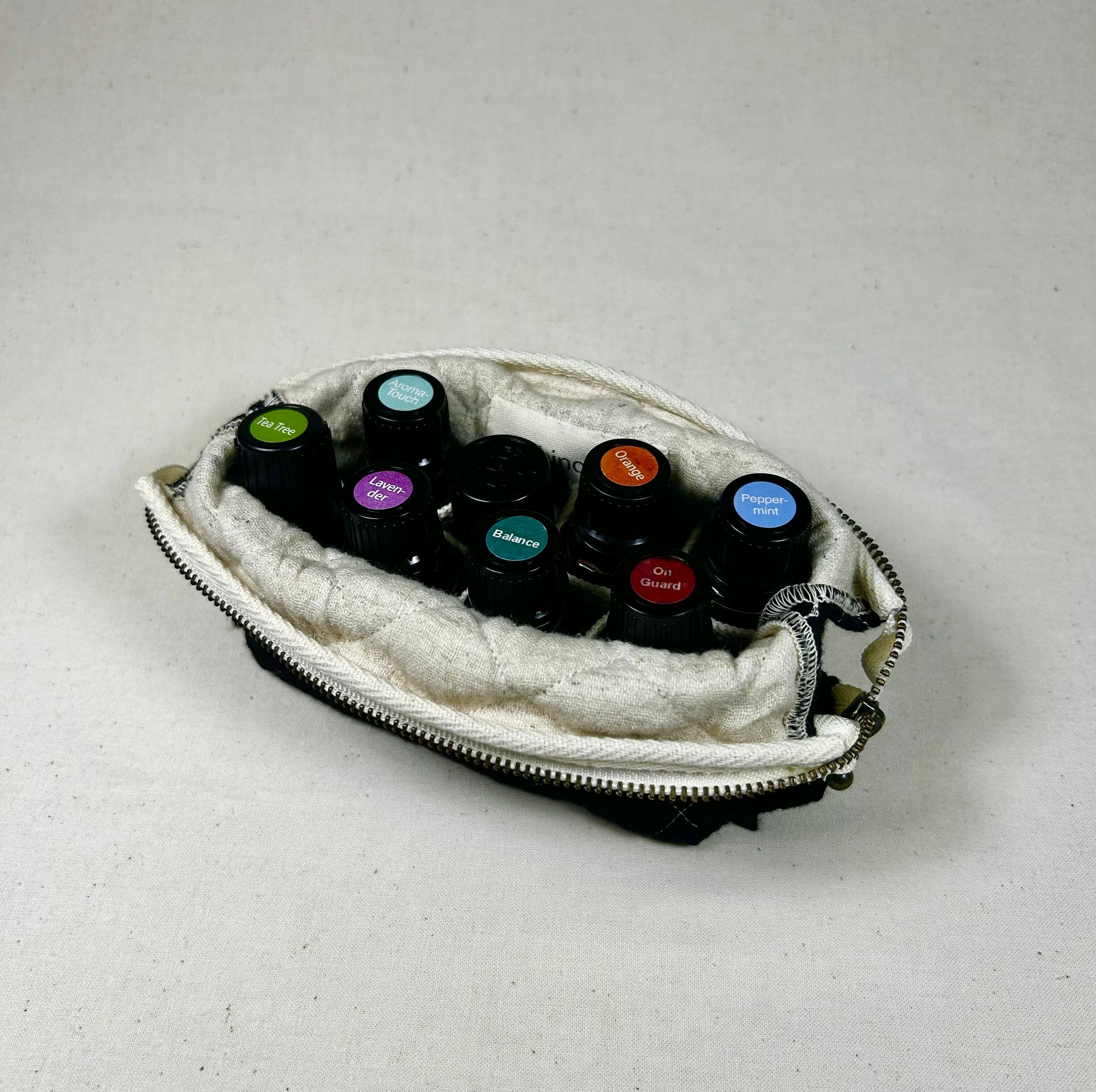 アロマポーチとしてだけでなく、オイルスタンドとしても使えるマルチ機能なキルトのアロマポーチ。口をめくればそのままオイルスタンドになります。ガウンと同素材で仕立てられているためセットで持てば統一感がでます。エッセンシャルオイル8本をしっかり収納できる取り外し可能な仕切りがついており、アロマポーチとしてだけでなく小物入れとしてもお使いいただけます。施術時の使い勝手の良さを追求したデザインで、毎日のアロマタイムをより豊かなものにしてくれます。このアロマポーチがあなたの日常をより心地よく彩りますように。ぜひ、お手元にお迎えしてください。